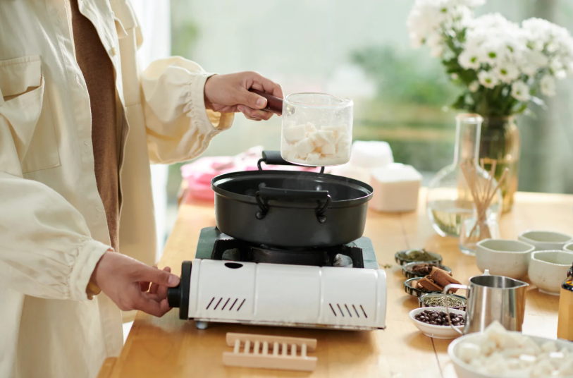 Il bagnomaria è il metodo più sicuro e controllato per sciogliere cere, burri e ingredienti solidi senza surriscaldarli o bruciarli. Può essere improvvisato con una pentola d’acqua e un recipiente di vetro, oppure acquistato come attrezzatura specifica. Il vantaggio del bagnomaria è il riscaldamento uniforme e delicato, che preserva le proprietà degli ingredienti naturali.